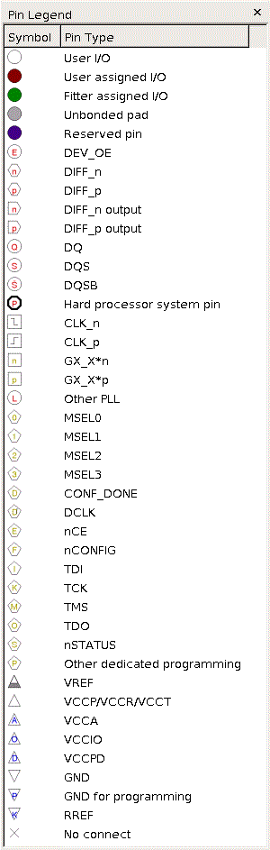 Lists the following symbols designating the pin types that appear in the Pin Planner device view.