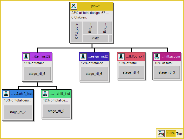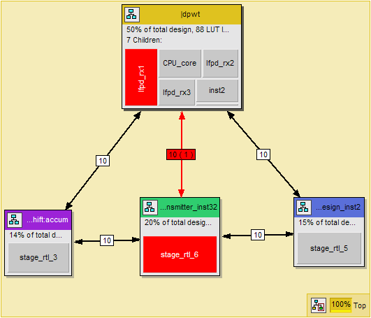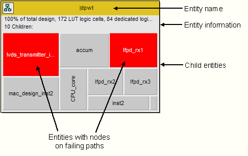 The entity's name appears in the colored bar at the top of the entity. Additional information, including the number of logic cells used by the entity, the percentage of the design represented by the entity, and its number of children, is shown immediately below the colored bar. Shown in gray within each entity is a layer of top-level glue logic, part of which connects the parent entity with its children. The immediate child entities appear at the bottom of the entity. Child entities that contain one or more nodes residing on failing paths are shown in red.