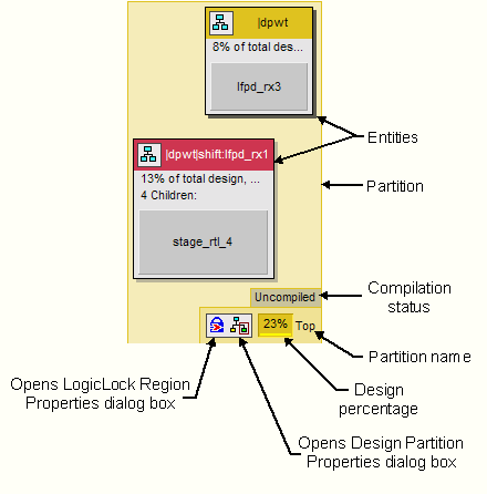 Design partitions appear as translucent boxes containing all entities that reside in that design partition; the color of each partition matches its color in the Design Partitions window. A control area at the lower right corner of the partition displays the partition name, compilation status, and provides controls for user interaction. Partitions that are uncompiled, or that have changed since the last compilation, are labelled uncompiled immediately above the control area at the bottom of the partition. Partitions that have been imported are labelled imported.