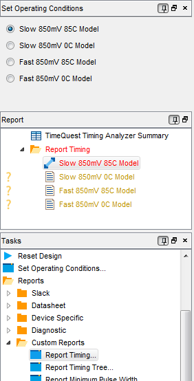 Select a voltage/temperature combination and double-click Report Timing under Custom Reports in the Taskspane.