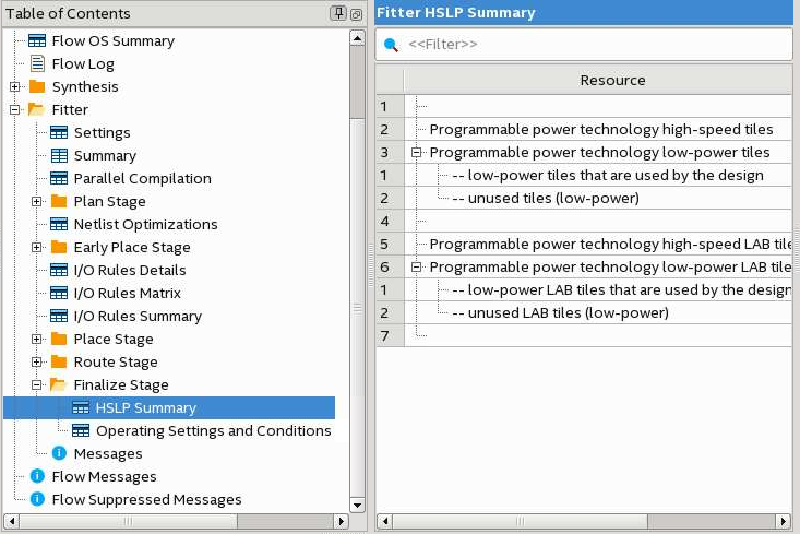 The Finalize stage reports describe final placement and routing operations, including Programmable Power Technology tile and delay chain summary information.