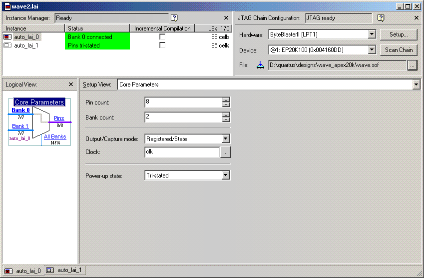 The Logic Analyzer Interface Editor consists of four panes (Instance Manager, Logical View, Setup View, and JTAG Chain Configuration) that provide the controls required to set up and configure the hardware and software to make them compatible for exporting debug data. You can show or hide the Instance Manager, Logical View, or JTAG Chain Configuration panes by clicking on the View menu and selecting or de-selecting the view of your choice.